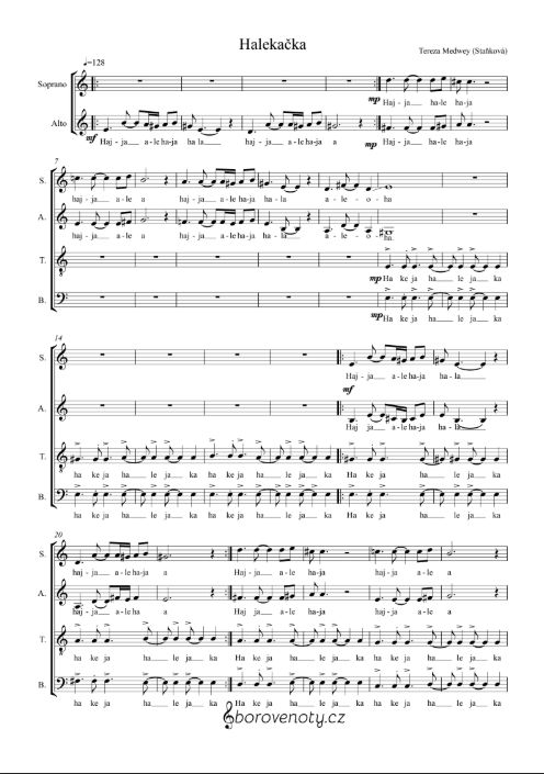 | Popis | Halekačka je velmi rytmická skladba. psaná pro sbor S - Ms -A - T - B a dvě sólistky v sopránu.